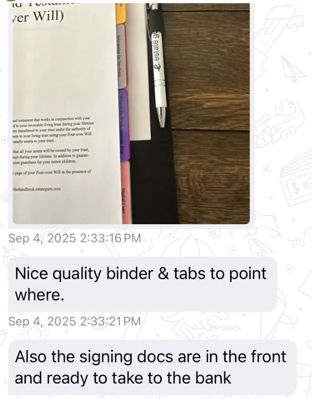 We make it easy for you sign, notarize, and put the estate plan into effect. You will receive a cloud account to store documents and a binder organizing all of your documents to have notarized and stored.
